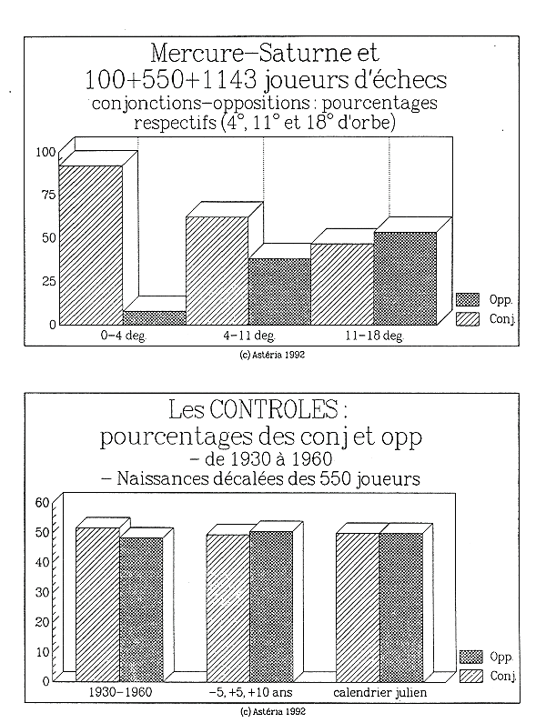 Estudio de la distribución de conjunciones y oposiciones de Mercurio y Saturno en los jugadores de ajedrez de alto nivel. Estos dos planetas están considerados por la tradición astrológica como ligados a la reflexión, la concentración y la investigación (Saturno), la agilidad mental y el juego (Mercurio). La oposición sería paralizante (bloqueante), la conjunción sería a la inversa: un factor de cohesión. La literatura astrológica subraya estas diferencias:
