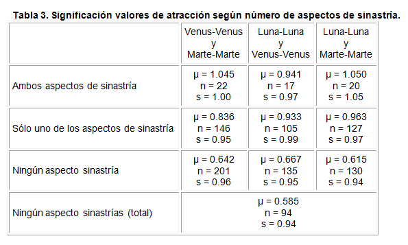 Lo que obtenemos con este análisis está, de nuevo, de acuerdo con la hipótesis. Más de un aspecto sinastrías aumenta el valor atracción (μ = 1 para cada uno de los «dos» grupos), mientras que una falta total de aspectos sinastrías produce la atracción más bajo (μ = 0,585). De hecho, si comparamos este último valor con los promedios de la tabla 2 (uno o más aspectos), los niveles de significación se convierten en 1%, 5% y 2% (utilizando de nuevo la prueba de la t, pero con 0.585 como valor de referencia).