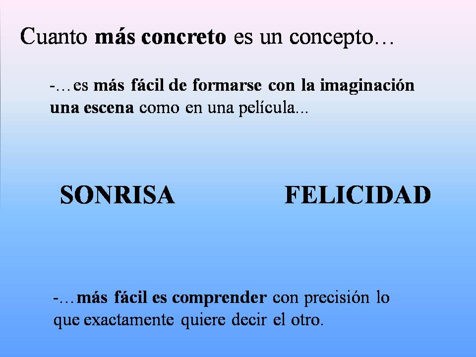 Cuanto más concreto es el concepto más fácil es comprender con precisión lo que exactamente quiere decir el otro. Esto es lo opuesto a la ambigüedad de lo abstracto. Qué es más fácil de comprender: ¿qué es sonreír o qué es la felicidad? O volviendo a ejemplos anteriores, qué es más fácil de comprender: ¿qué es un perro o la vida? ¿Una silla o qué es la practicidad?