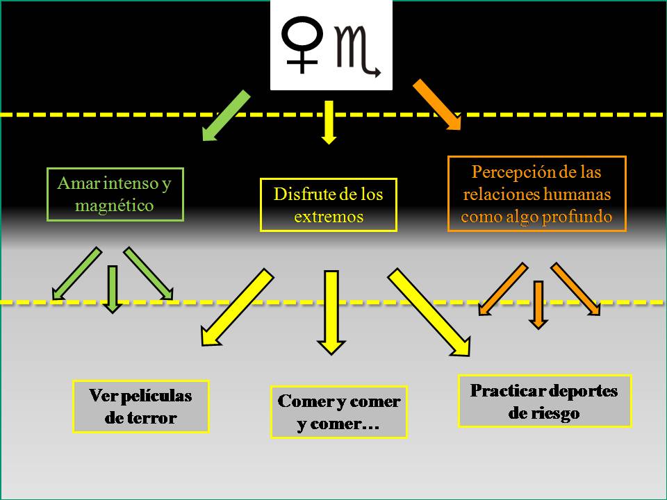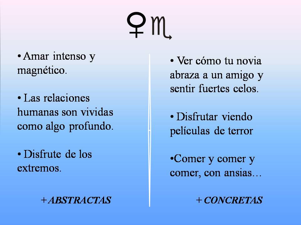Veamos esto con un ejemplo. Imaginemos Venus en Escorpio. Estamos utilizando un lenguaje muy abstracto, superabstracto. Todos nosotros, los que llevamos años en esto, tenemos sensaciones, intuiciones e incluso tendremos flashes de lo que pueda significar. En una primera aproximación podría bajar el nivel de abstracción hasta decir cosas como “Amor intenso y magnético”, “Disfrute de los extremos”, “Percepción de las relaciones humanas como algo profundas”. Para sintetizar quedémonos sólo con “Disfrute de los extremos”, Esto se podría manifestar de formas diferentes. Podría hacer al nativo con Venus en Escorpio alguien que le gustara ver Películas de Terror, o bien alguien que comiera con ansias, con gula con prisas, o bien sería alguien bastante promiscuo que tendría sexo con varias parejas en una sola noche.