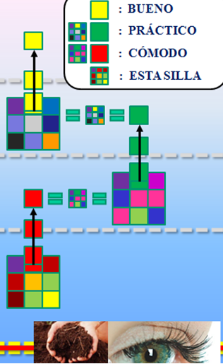 Puedo significar que esta silla que es cómoda, por ser cómoda, es PRÁCTICA. ¡Pam! Otro juicio y otra abstracción: “La comodidad es práctica”. El cuadradito rojo que teníamos antes -y que representaba la propiedad de ser cómodo- también contiene sus propiedades y también le acabo de abstraer una propiedad en particular, en este caso, la propiedad de ser práctico.