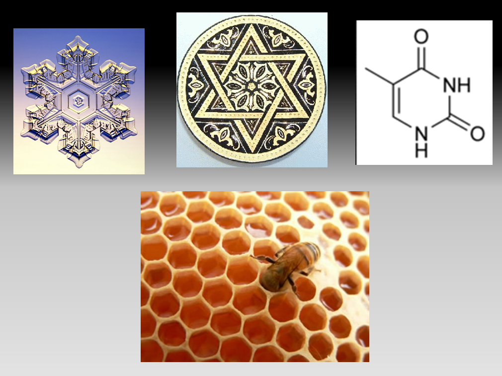 En la estructura cristalina del agua, en la timina (base nitrogenada del ADN), en los panales de abejas, etc.