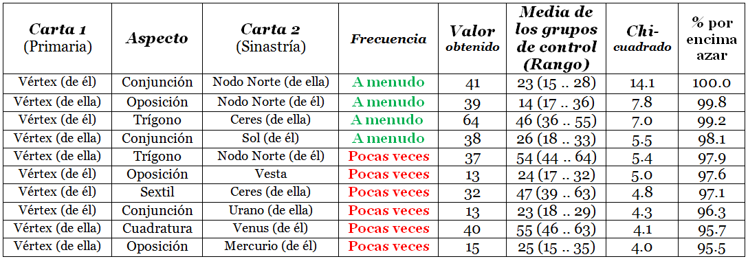 Resaltar que este artículo contiene un Excel para que cada lector seleccione los factores que quiere poner en relación (p.e. mirar qué vínculos se hallaron entre el Venus de ella y el Marte de él). De todas maneras, esta publicación es un análisis que no dejará indiferente.