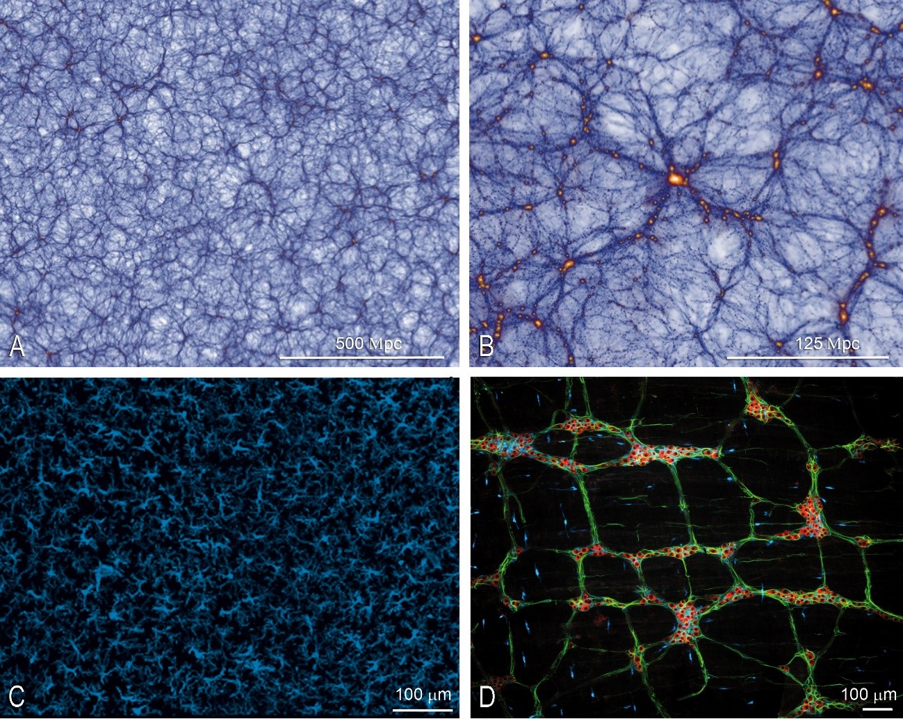 Se refiere, por ejemplo, a las similitudes gráficas entre la distribución de la materia oscura en el universo y la distribución de las células microgliales en la corteza cerebral, que forman el sistema inmunitario del sistema nervioso central y constituyen aproximadamente el 10% de las células del cerebro.