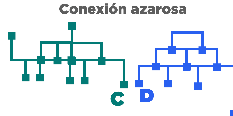 Para empezar, contemplo la posibilidad de que nos pasen cosas fortuitas, es decir, que realmente existan los accidentes, que dos sucesos provenientes de cadenas causales diferentes se encuentren por azar. Quiero decir que podemos recibir el disparo que iba dirigido a otro, por ejemplo. En el gráfico veríamos que C y D se encontrarían como resultado de caminos independientes. C aquí sería una persona paseando tranquilamente y D la bala pérdida de un tiroteo cercano. No habría conexión significativa, no habría un sentido oculto, pero ambos se encontrarían. En resumen: no habría causalidad ni tampoco correlación, que no son lo mismo, sino lo que habría es una conexión fortuita, una coincidencia.